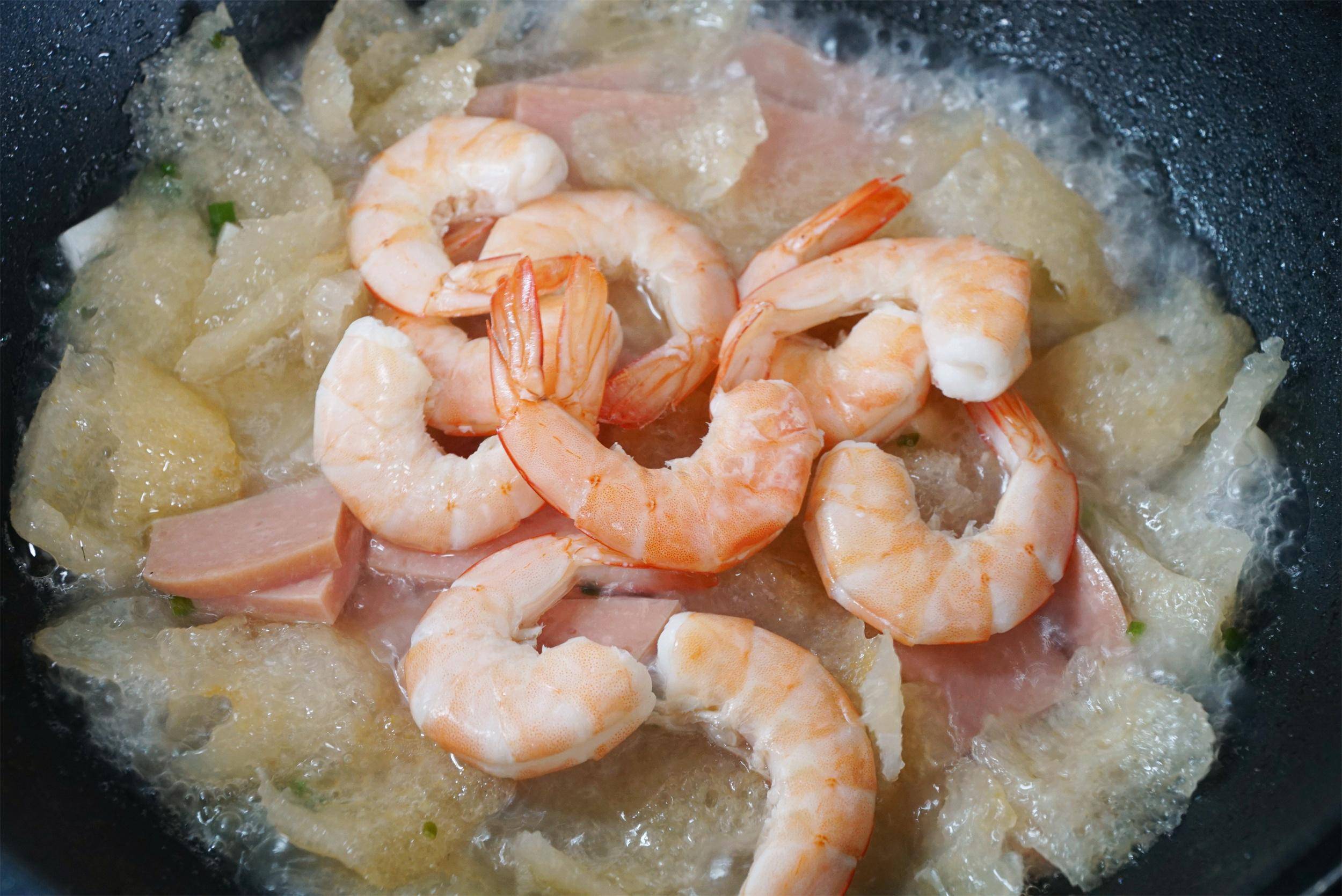 3、锅中倒入适量开水,煮开后加一勺鸡精、适量盐和少许胡椒粉,翻炒均匀放入午餐肉和虾仁。