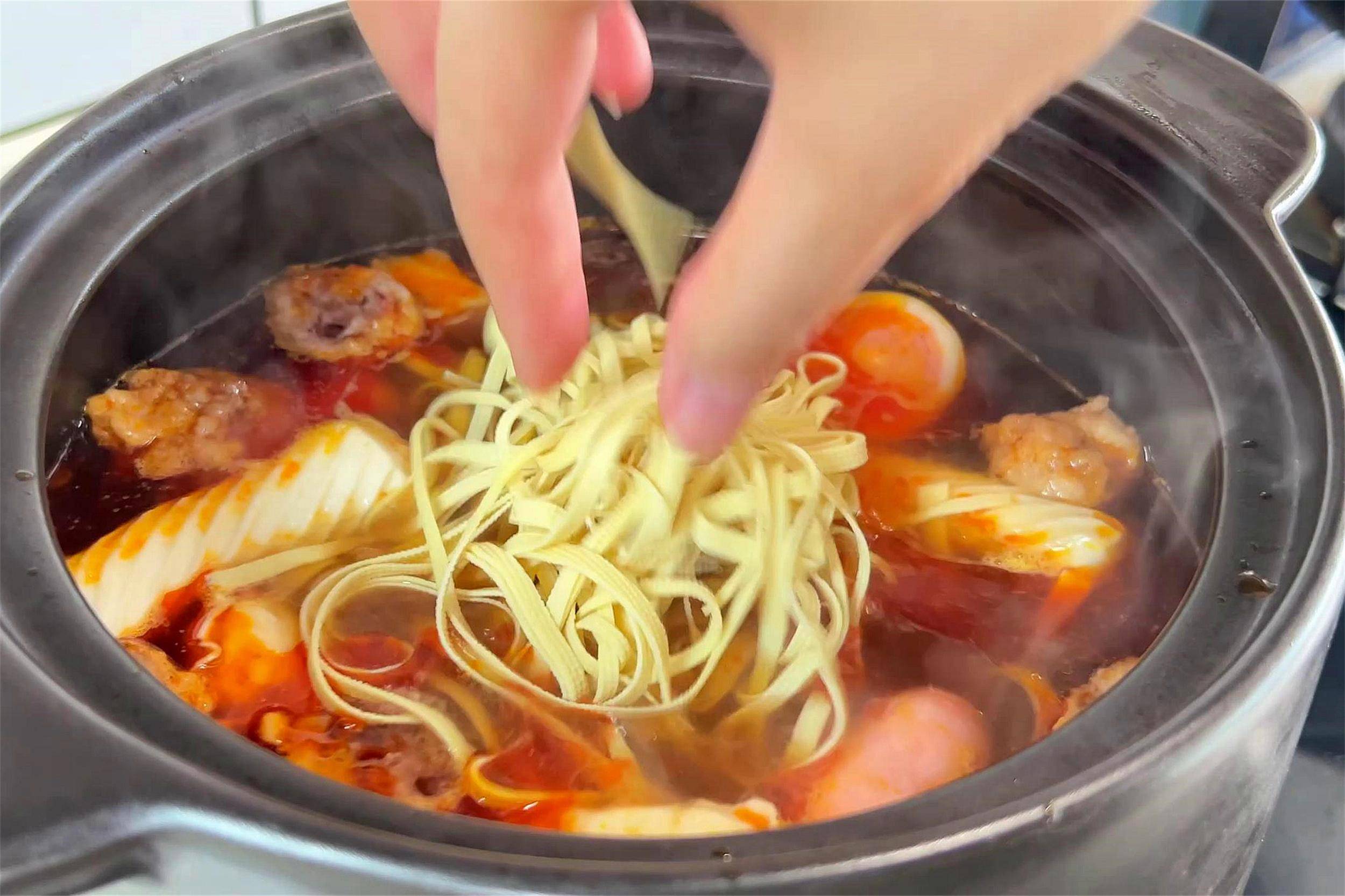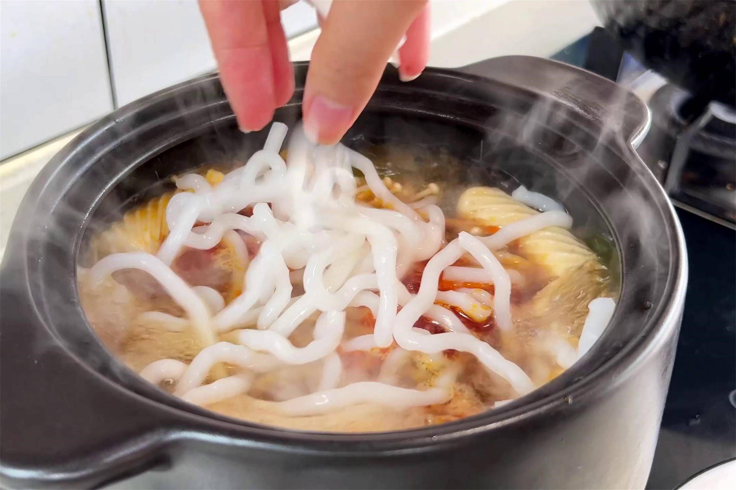 第三道:【砂锅土豆粉】所需食材:土豆粉一袋、豆腐皮、海带、海鲜丸子、肉丸、上海青、金针蘑、鹌鹑蛋、火锅底料、生抽、蚝油、盐、鸡粉、白糖