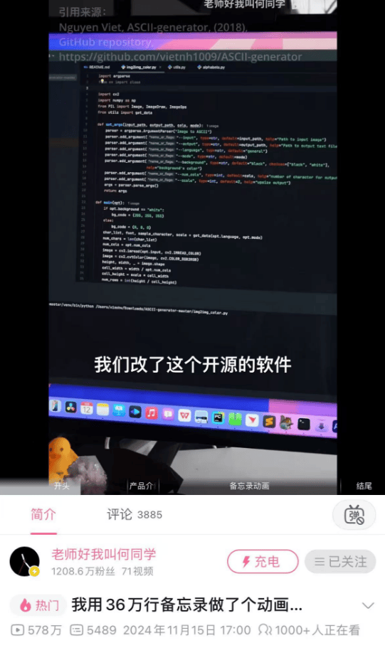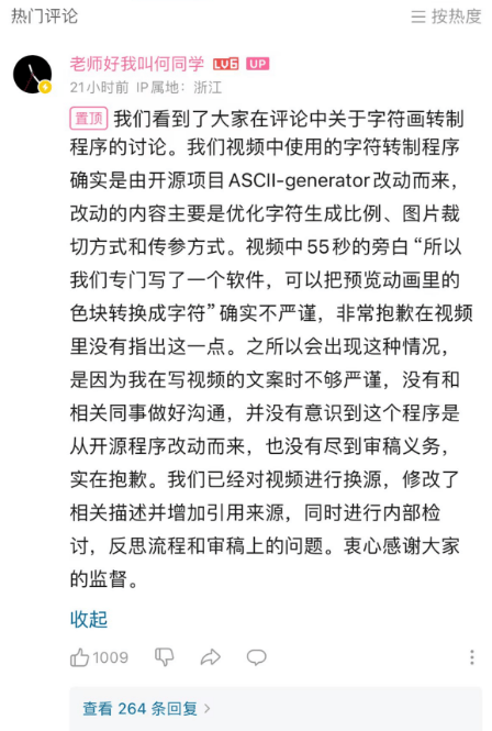 11月15日,何同学在哔哩哔哩上发布新视频《我用36万行备忘录做了个动画…》,其在视频中介绍核心功能字符转制程序时声称“我们专门写了一个软件”。 但是随后有网友指出,该软件是GitHub上颇受欢迎的开源项目“ASCll-generator”,但在视频中文案表述却是“原创”,且还删除了原作者的信息。 11月19日下午,何同学在该视频的评论区致歉并且回应了质疑。